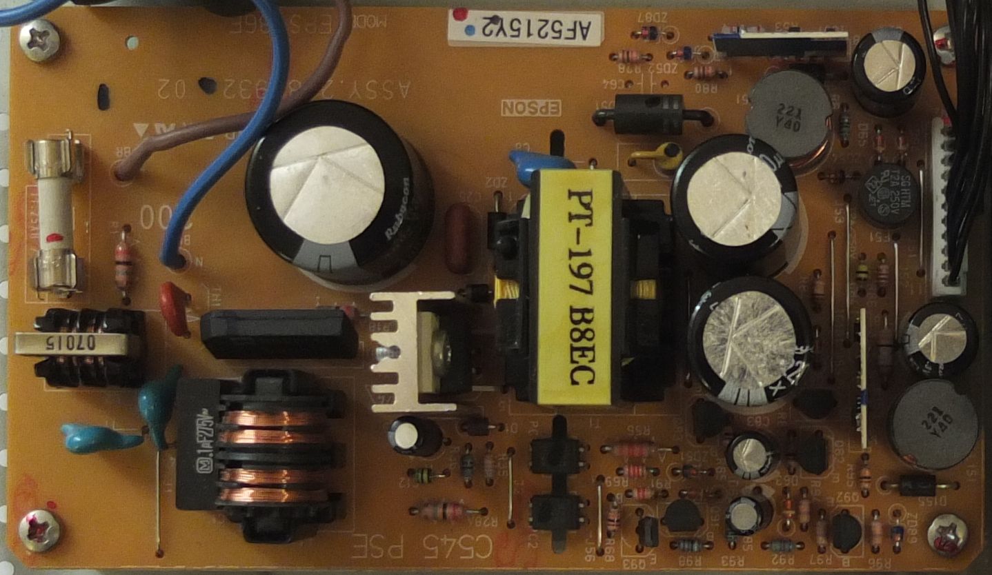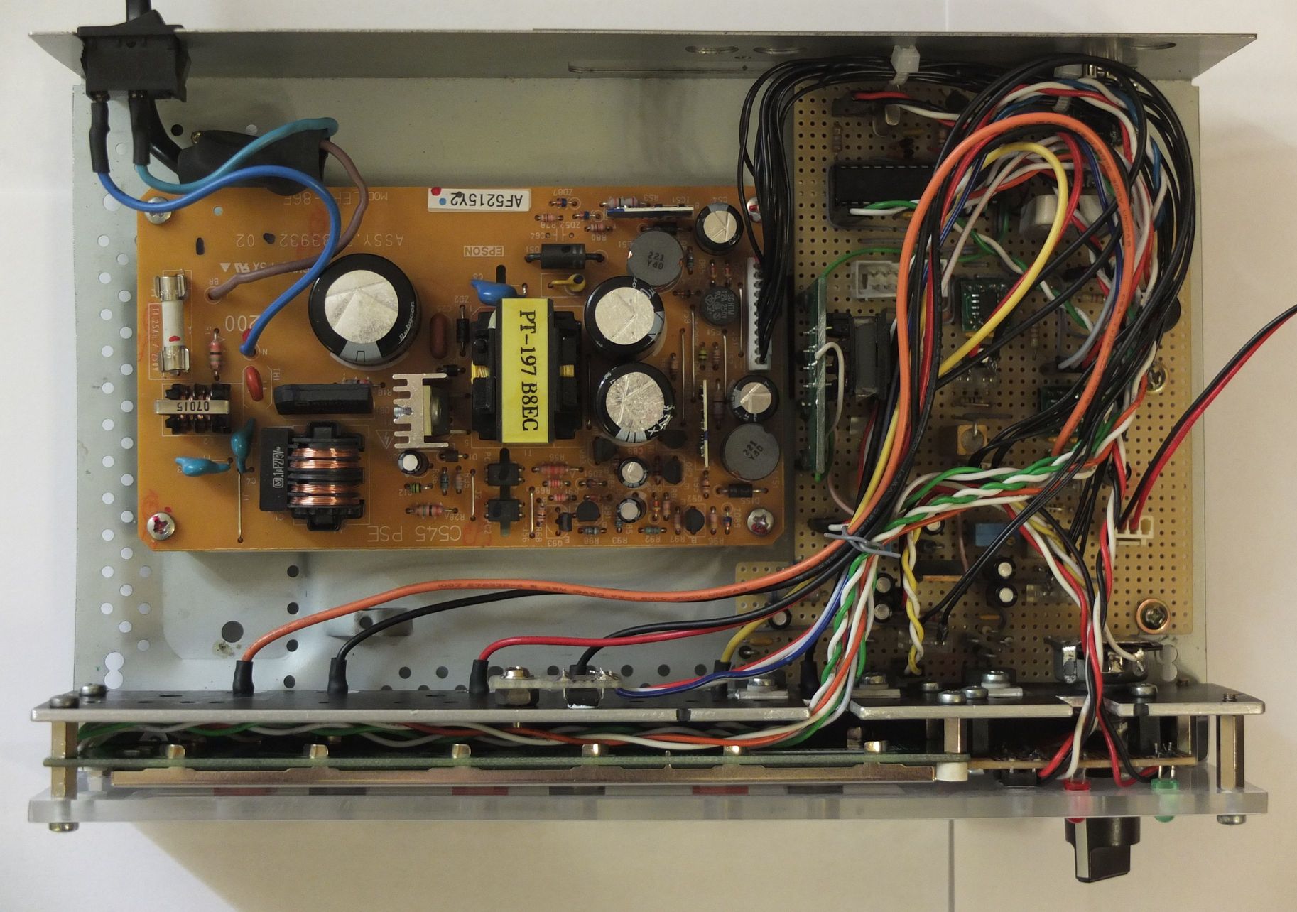 Labornetzteil geöffnetDas Netzteil wurde eingebaut in das Gehäuse eines alten Satelliten-Receivers. Im Bild links zu sehen ist das Schaltnetzteilmodul.Schaltnetzteil Dieses stammt aus einem defekten Multifunktionsdrucker. Ursprünglich war die Leiterplatte in einem Metallgehäuse montiert, welches entfernt wurde, um Platz zu sparen. Der Netzanschluss wurde ergänzt durch einen Netzschalter an der Rückwand des Gehäuses. Auf der rechten Seite ist die Leiterplatte montiert, die die selbst entworfene Schaltung aufnimmt. Die Frontplatte ist aus Plexiglas selbst angefertigt. Die Beschriftung dafür ist auf Papier ausgedruckt und in selbstklebende Laminierfolie laminiert. Der Displayausschnitt lässt sich mit einem herkömmlichen Cuttermesser realisieren. Die runden Ausschnitte für Taster und LED lassen sich gut mit den passenden Locheisen ausstanzen. Hinter der Frontplatte wurde das Display montiert. Die 3 Spannungsregler vom Typ LM317HVT sind auf dem Kühlblech dahinter isoliert montiert, da deren Gehäuse nicht auf Massepotential liegt. Kühlblech mit LM317HVT und DS1621 Außerdem ist an das Blech ein Thermometer-Schaltkreis DS1621 auf einer kleinen Leiterplatte angeschraubt. Abhängig von dessen Temperatur wird ein kleiner Lüfter geregelt. Der Lüfter ist auf den Bildern nicht ersichtlich. Er ist an der rechten Seitenwand angeschraubt. Das Potentiometer zur Einstellung der Ausgangsspannung ist ebenfalls auf dem Kühlblech befestigt. Zwei Taster und 2 LED sind auf einer kleinen separaten Leiterplatte oberhalb des Potentiometers befestigt.